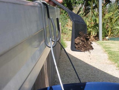 The bucket hanger is designed to sit on the face of the gutter, so when placing debris into your bucket it will not spin. This avoids making gutter cleaning any more difficult than it has to be.